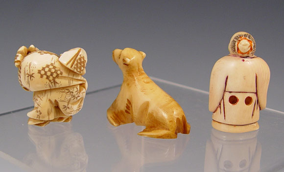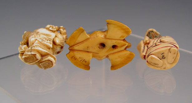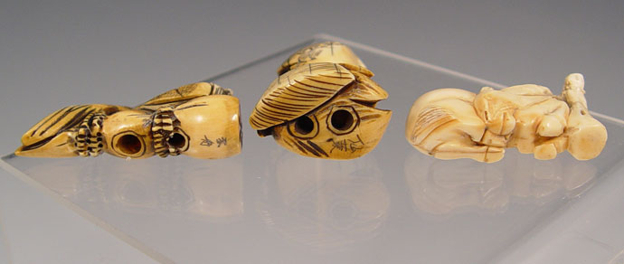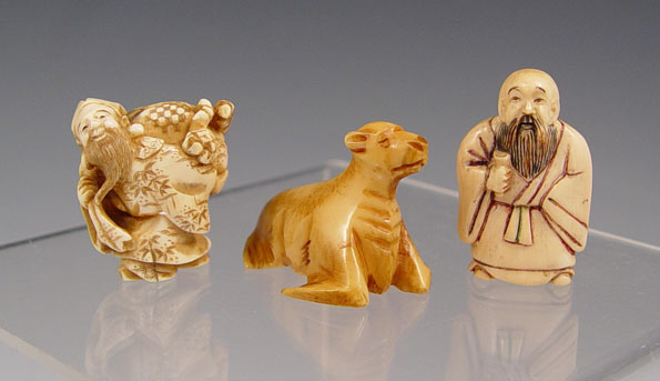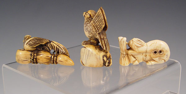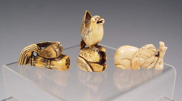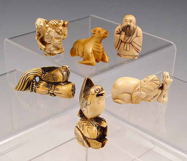 6 JAPANESE CARVED IVORY NETSUKE: Includes 1) Man with sack, 1 1/2'' h. 2) Man with cup, 1 5/8'' h. 3) Bird perched on flower, 2 1/8'' h. 4) Seal, 1 3/8'' h. 5) Fancy chicken perched, 2 1/4'' long. 6) Reclining horse tied to post (note pronounced age crack), 2'' long. All pieces signed in characters.