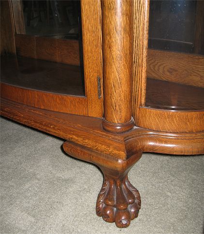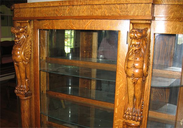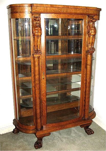 GOLDEN TIGER OAK HORNER QUALITY BOWFRONT CHINA CABINET: Pronounced full body carved griffins, columnar stiles, & paw feet. Mirror back, glass shelf interior. Measures 69 1/4'' high x 47'' x 19''
