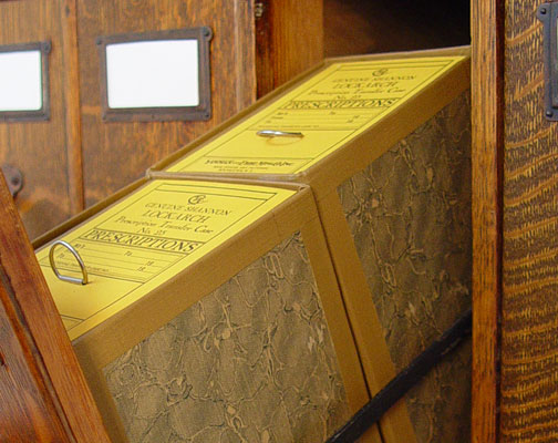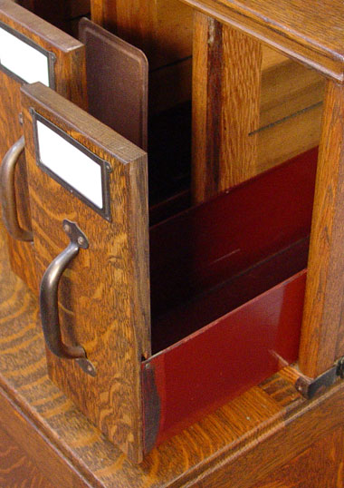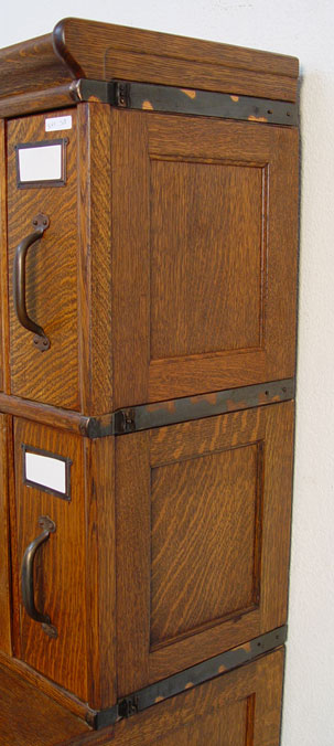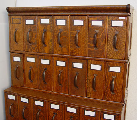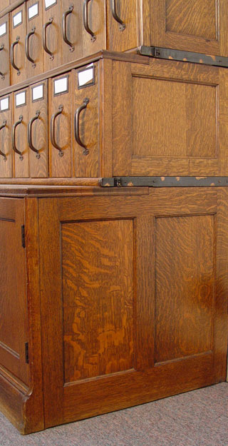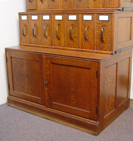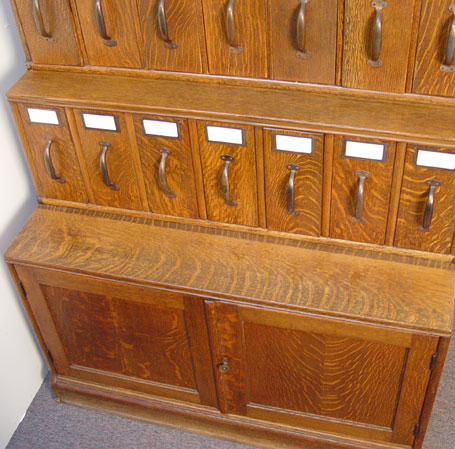 VINTAGE 4 STACK TIGER OAK FILE: With 21 vertical files. The stacks from top to bottom are 7 vertical drawers, 7 vertical drawers, deeper 7 vertical drawers and 2 door base. Measures 66'' h. x 41 1/2'' x 26''