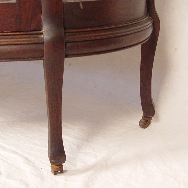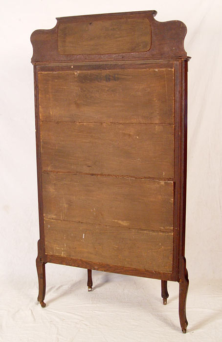 OAK BOWFRONT CHINA CABINET / CURIO: Mirrored back, 3 wood interior shelves. Unique shelf above mirrored crest. Measures 69'' h. x 36'' x15 1/2''.