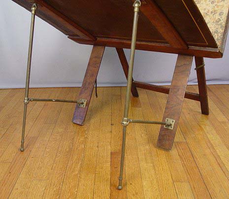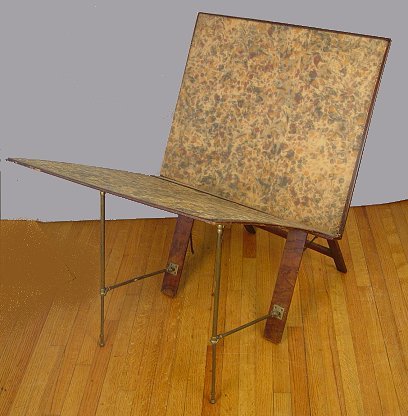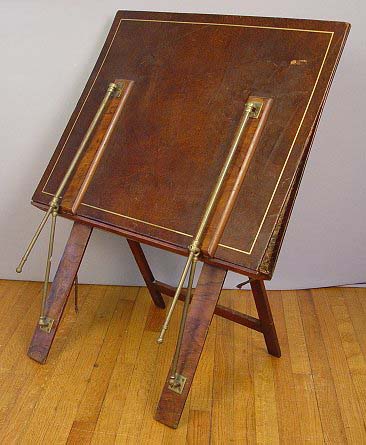 LEATHER FOLDING MAP STAND: Late 19th C., stamped Bunyard, London, burled wood legs with brass hinged supports, repair to leg. 44'' x 32'' x 7'' when collapsed for transport. Some wear to leather on edges.