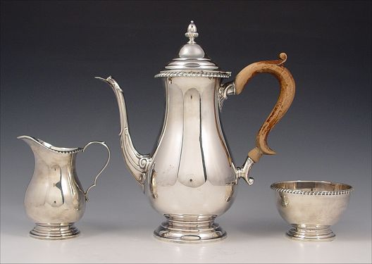 3 PIECE STERLING COFFEE SET: Hallmarked Sterling in lozenge. To include 1) 1 1/2 pint coffee pot with wood handle, hinged lid, 9 1/4'' x 9''. 2) Open creamer, 4 1/4'' high. 3) Waste bowl, 2 1/4'' x 3 5/8'' dia. Approx. 26.8 troy oz, note weight includes wood handle.