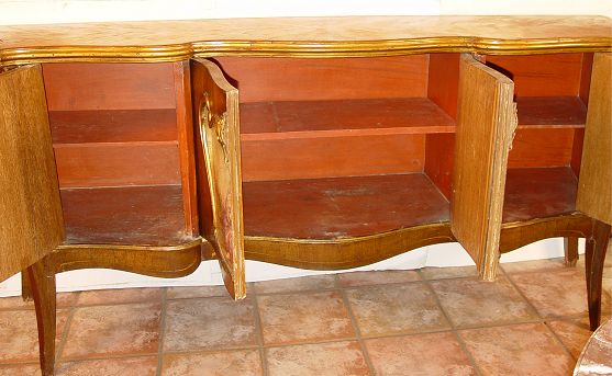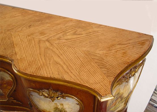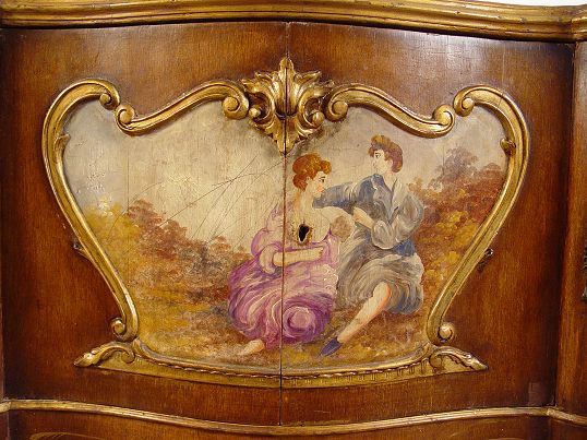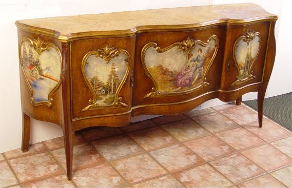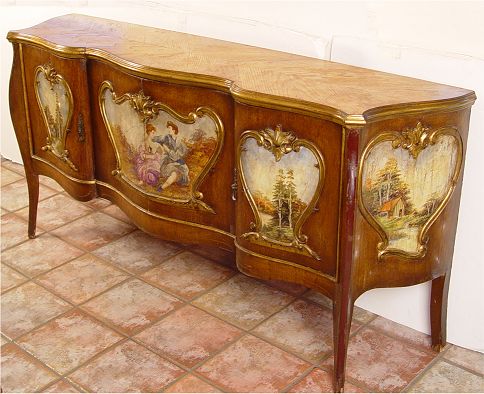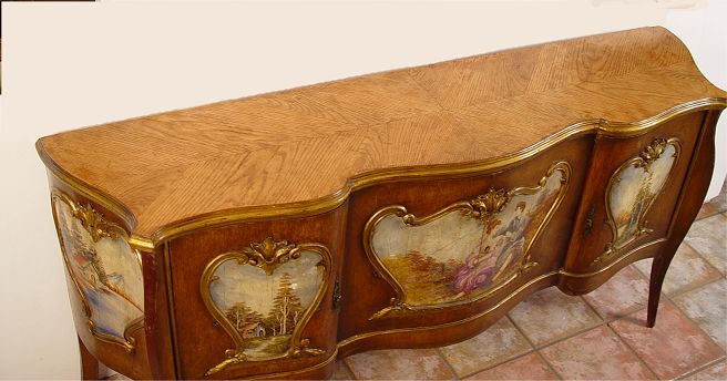 DECORATIVE FRENCH STYLE PAINT DECORATED SIDEBOARD: Sculpted serpentine front, 4 doors. Oak veneer case with painted panels framed in gilt molding, simple French feet. Striped matchbook veneer top. Somewhat worn condition. 37 1/2'' tall x 78'' x 19'' deep.