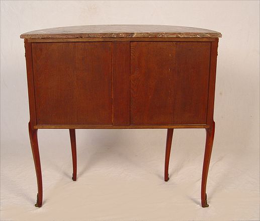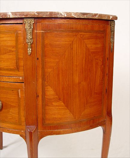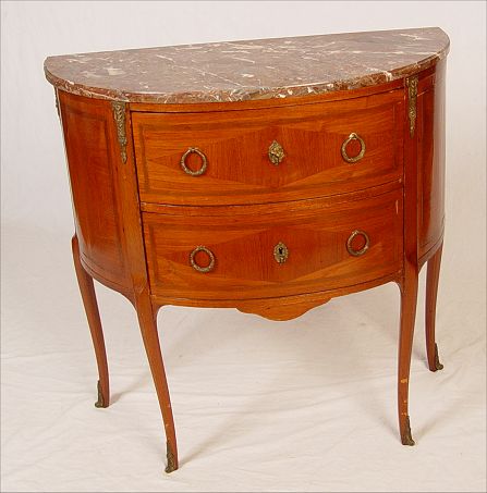 FRENCH PARQUETRY INLAY DEMI COMMODE: Half round demi-lune chest finely inlaid in a diamond pattern with banded drawers. Brass pulls, lion head ormolu. Early to mid 20th C.