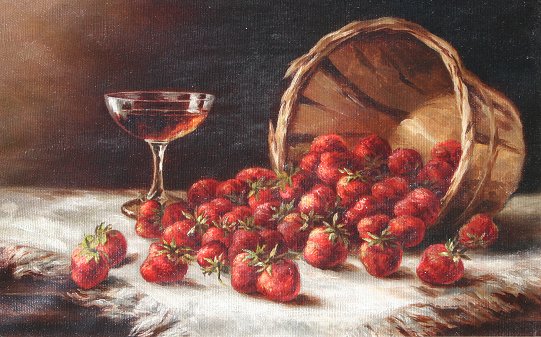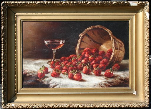 AMERICAN SCHOOL OIL/CANVAS PAINTING OF STRAWBERRIES IN A BASKET FROM THE CIRCLE OF AUGUST LAUX: 12'' x 19 1/2'', encased in a period gilded gesso frame with missing portions of gesso, 18'' x 25 1/2''.