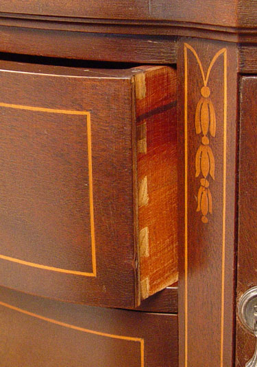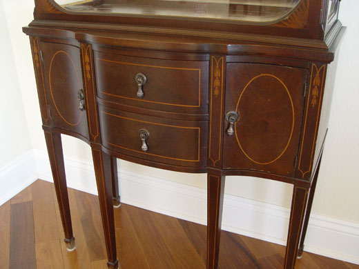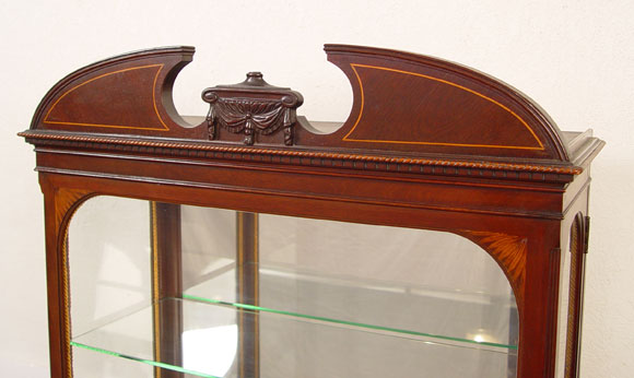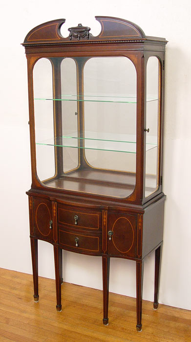 HEPPLEWHITE STYLE DIMINUTIVE CURIO: Mirrored back with 2 glass shelves over 2 drawers and 2 doors. String inlay on case. Measures 66'' h. x 29 1/4'' x 15''.