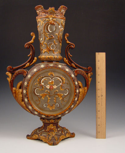 W. SCHILLER & SONS BOHEMIAN EARTHENWARE BOTTLE NECK VASE: Ca. 1885. Majolica and matt glaze earthenware. 18 1/2''h.