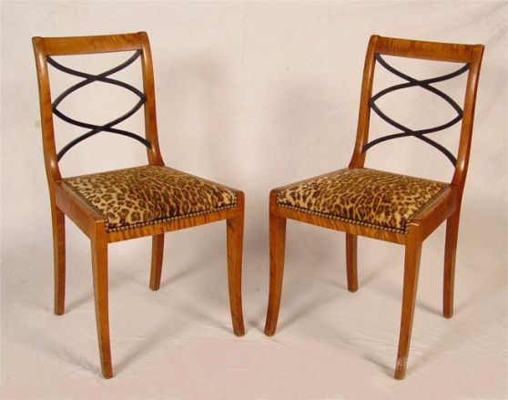PAIR OF BIEDERMEIER SIDE CHAIRS: Simple satin wood with ebony black backs, studded leopard fabric seats. 33'' tall x 19' deep x 18'' wide.
