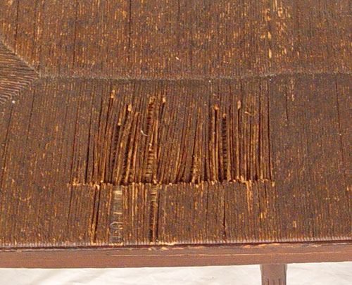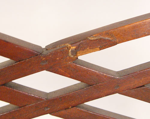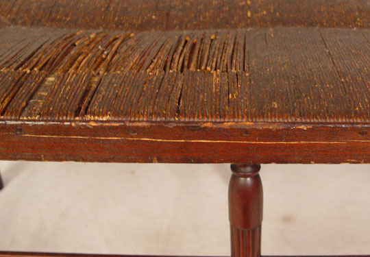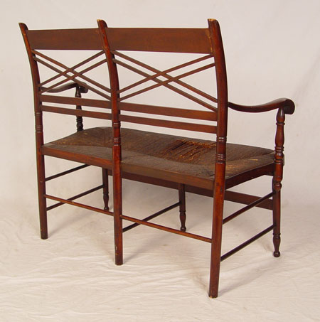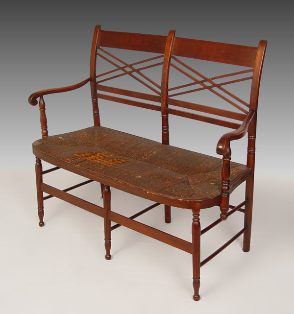 AMERICAN COUNTRY SHERATON THUMBACK SETTEE: Open back with cross stretchers, scrolled hand holds, rush seat framed in bent wood. Peg construction. Please note break in one of the back straps, joints could use a tightening. 37'' tall x 43 1/4'' x 21'' deep.
