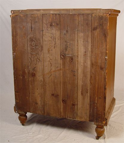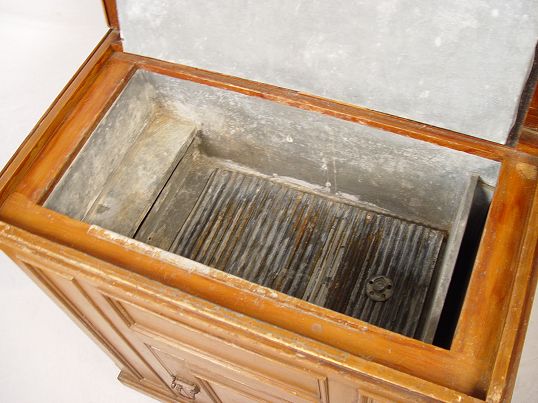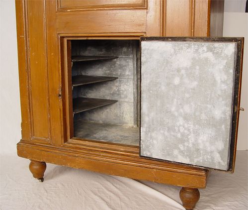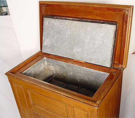 LATE 19th C AMERICAN COUNTRY LIFT TOP ICE BOX: Original acorn painted finish. Double lift top over single lower door. Fully lined and insulated interior. Recessed and molded panels, brass door latch and castors. 49 1/2'' tall x 40'' x 24''.