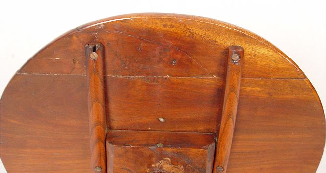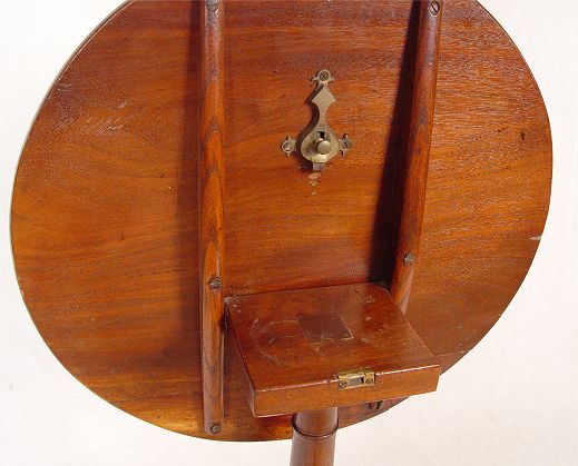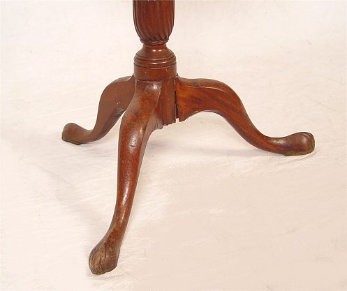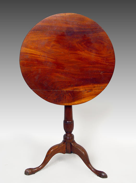 FEDERAL PERIOD MAHOGANY TILT TOP CANDLE STAND: Round top, tripod base with the pedestal having simple carvings. Early repair to one foot. The original brass latch warrants a repair to keep the top stable. 26 1/2'' tall, 21'' dia.