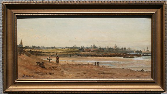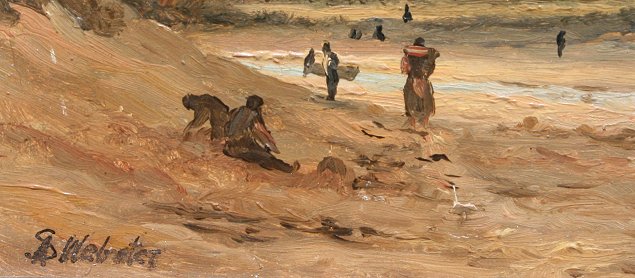 WEBSTER, Sarah A., (American, 19/20th C.): ''Fraserburgh'', coastline with figures and town in the distance, OIL/Paper/Board, 6 3/4'' x 9 1/2'', signed, titled verso, gilded frame with minor wear, 8 1/4'' x 11 1/4'', Frank Jarman Limited fine art dealer label verso.
