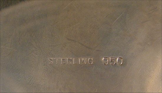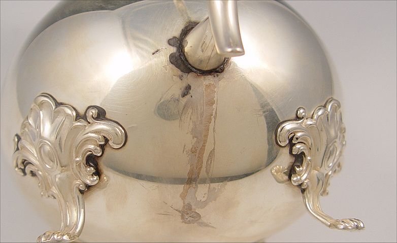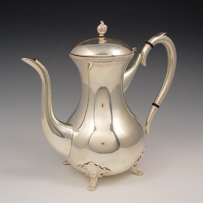 STERLING COFFEE POT: Simply marked 950 Sterling. Ebonized wood rings on handle. Approx 27.3 troy oz. Measures 9 1/2'' high x 10 3/4'' overall.