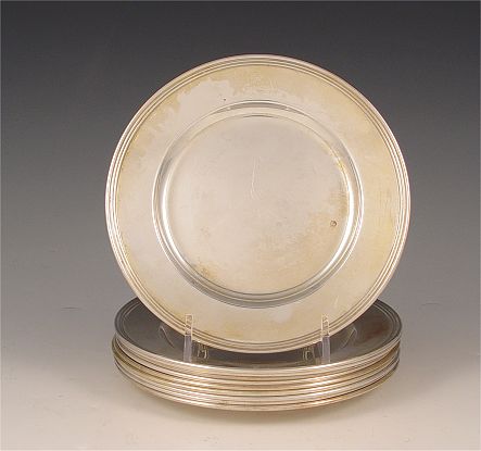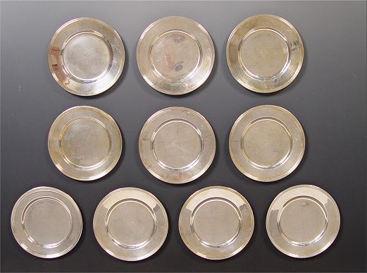 10 PIECE INTERNATIONAL STERLING BREAD PLATES: 8 in the Lord Saybrook patter, 2 in similar pattern. 6'' dia. Approx 30.3 troy oz.