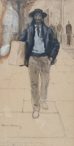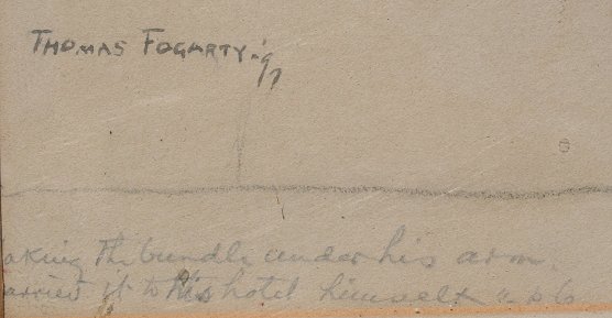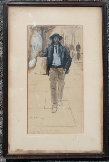 FOGARTY, Thomas, (American, 1873-1938): Man with a bundle, Gouache, Pencil & Watercolor, sight size 14'' x 7 1/4'', signed lower left, dated 97, pencil inscription reads ''taking the bundle under his arm, carried it to his hotel himself, pg 6'', wooden frame with wear, 21 1/2'' x 13''.