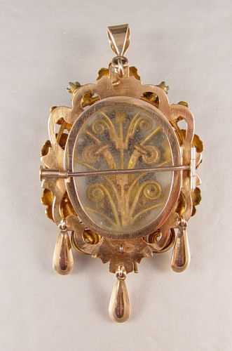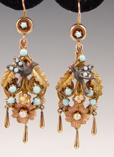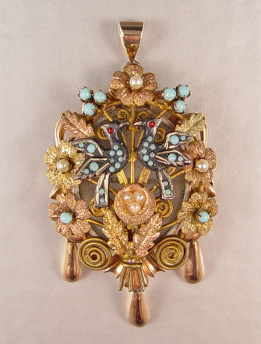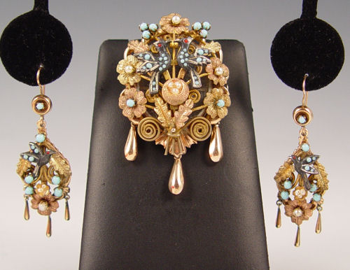 18K SPANISH BAROQUE REVIVAL TRI COLOR GOLD BROOCH & EARRING SUITE: Attributed to the craftsman Francisco Garcia Guevara, purchased in Guanajuato. 18K rose and yellow gold with sterling silver brooch and earring suite contains seed pearls and blue stones of unknown origin. The suite depicts a floral bouquet with birds and a nest of eggs. The brooch has a glass framed compartment on the reverse side. Bar pin closure with bail. Earrings have shepherds hook closures. Brooch and earrings have hanging tassels. Brooch measures approx. 2'' x 1 1/2'' Earrings measure approx. 1 1/2'' in length. Weight: 36.7 grams.