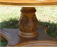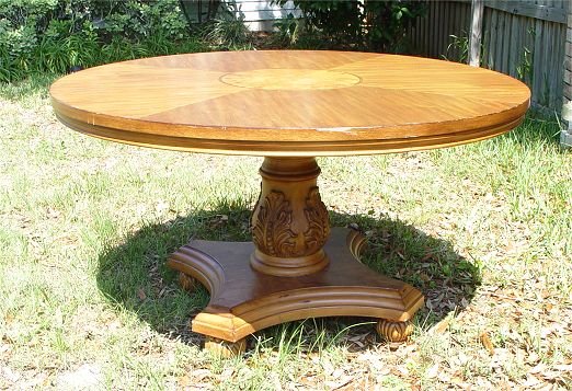 CONTEMPORARY INLAID DINING, CONFERENCE OR GAME TABLE: Geometric inlay center, single pedestal base. 31 h. x 54'' dia.
