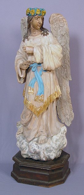 19TH C PAINTED, CARVED AND GESSOED WOODEN ANGEL: 54'' tall overall.