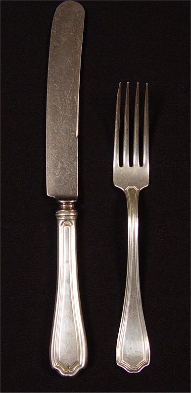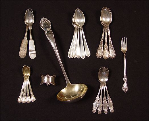 COLLECTION OF ESTATE STERLING FLATWARE SPOONS & MORE: Approx. 34 pieces to include 1) Gorham ladle in the Lancaster pattern, monogrammed, 10 1/2''. 2) 6 Gorham Old London teaspoons, monogrammed, 5 5/8''. 3) 4 Gorham demitasse spoons in the Chantilly pattern, monogrammed, 4 1/8''. 4) 6 Reed & Barton forks 7''. 5) 6 Reed & Barton hollow knives 9 1/4''. 6) 3 Dominick & Haff teaspoons in the cupid pattern, monogrammed, 6''. 7) Manchester cocktail fork, 6 1/4''. 8) 2 W & A Cooper coin silver teaspoons, note condition, monogrammed. 5 3/4''. 9) Sterling napkin ring, monogrammed, 1 1/2'' dia. 10) 4 Silverplate teaspoons, 5''. Approx. 26.3 troy oz.