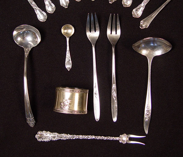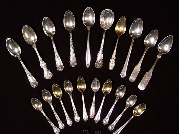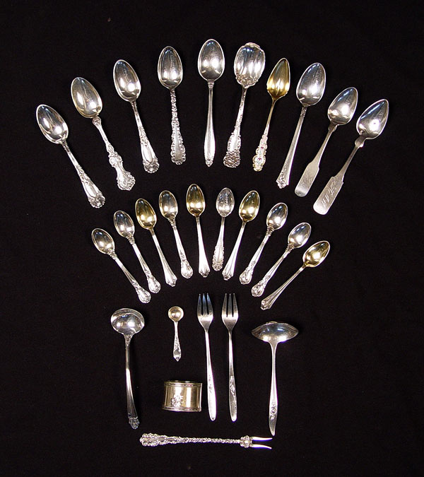 ESTATE COLLECTION OF STERLING SPOONS / FORKS: 27 pieces by assorted makers in assorted patterns. Some highlights include R. Blackington enamel teaspoon, Frank Smith teaspoons, R. Wallace cocktail fork & Spoon, Gorham demitasse spoons, 2 coin silver spoons, napkin ring (metal content unknown). Many pieces monogrammed. Approx 12.3 troy oz. sterling only.