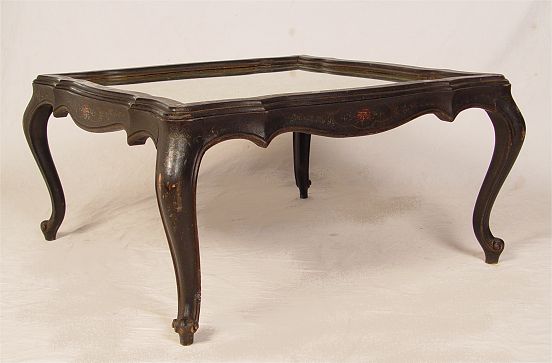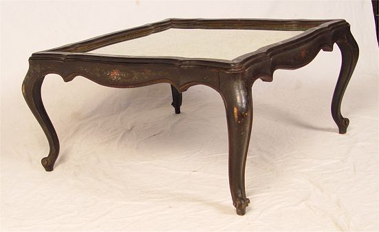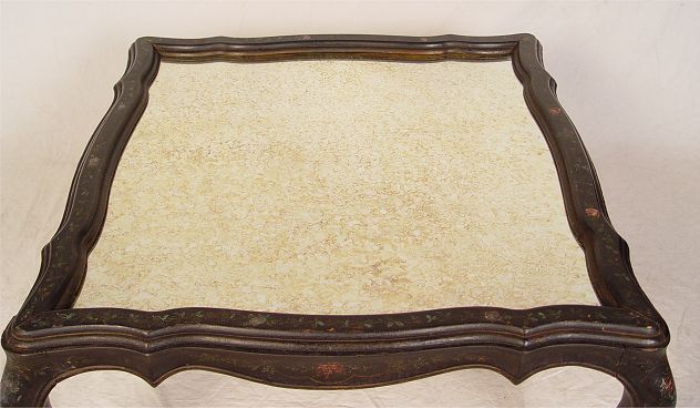 FRENCH 1920'S MIRROR TOP PAINT DECORATED TABLE: Hand painted flowers and garland design on black, mottled mirror top. Measures 17 1/4'' h. x 34'' square
