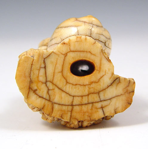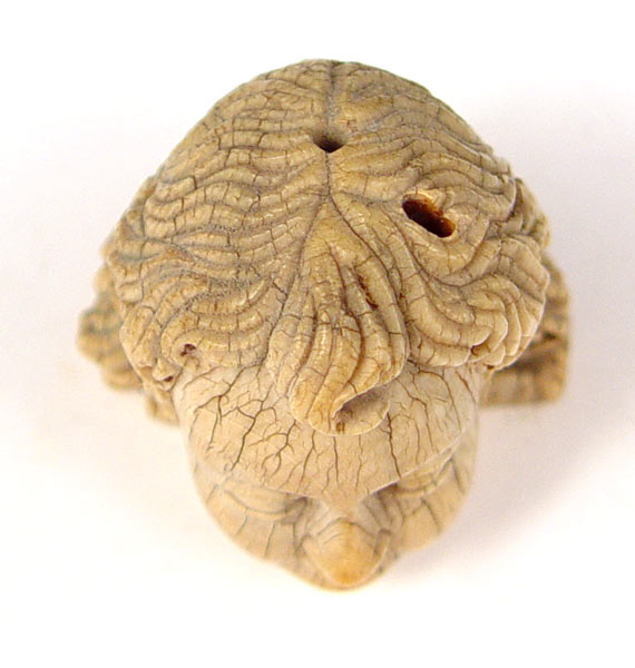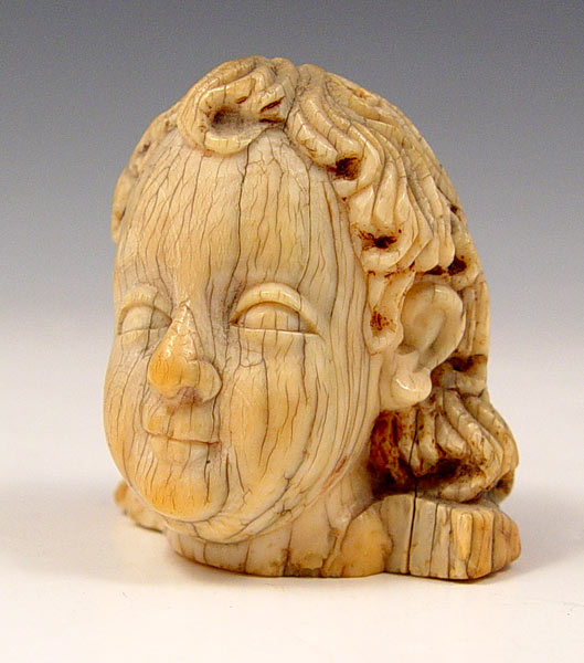 17th -18th C. CARVED IVORY HEAD: Probably the Christ Child carved in Gao, on the west coast of India, and exported to Europe. The hole on the underside was used to affix the head to its body. Evidence of red paint pigment. 2''