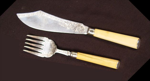 1895 LONDON IVORY HANDLE STERLING FISH SET: 1895 London hallmark, Sibray, Hall & Co. hallmarks. Ivory handles have age lines, ornately engraved blade and fork. Collars have separate hallmark from another maker, may be early remounts. Knife measures 12 1/2'', fork 9 1/2''