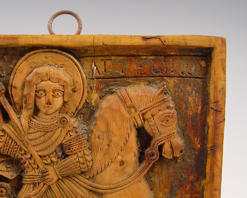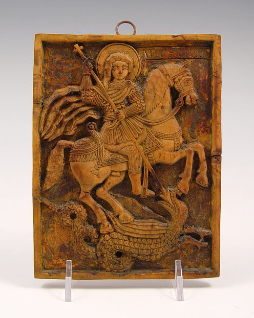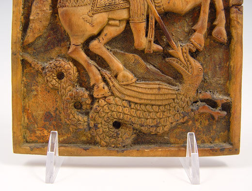 EARLY 19TH CARVED WOOD ST. GEORGE & THE DRAGON: Relief carved, 5 7/8'' x 4 1/2''.