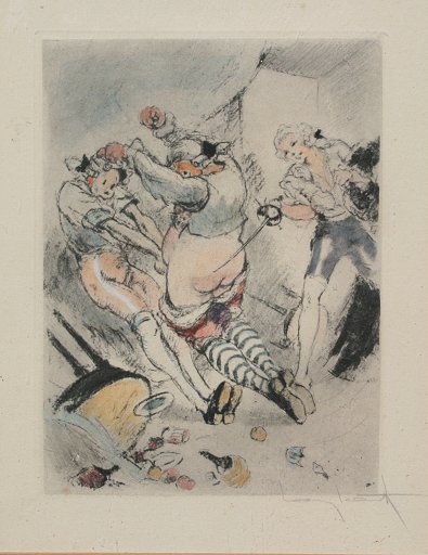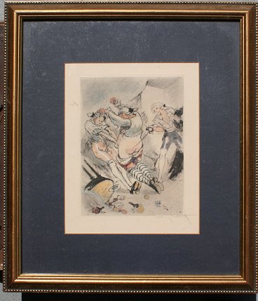ICART, Louis, (French, 1888-1950): ''Two Points'', Hand Colored Etching, sight size 9'' x 7'', pencil signed lower right, encased in contemporary gold frame, 15 1/2'' x 14''. From Felecia Ou Mas Fredaines, 1947.