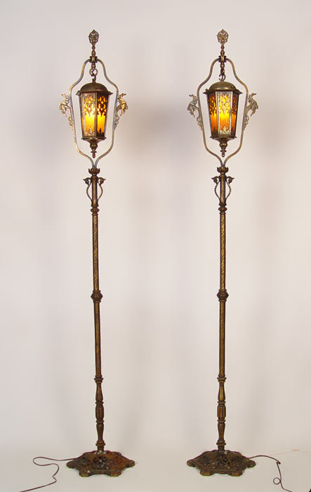 PAIR TORCHIERES ON STANDS: Electric. Measure 74'' h. x 12'' at widest point.