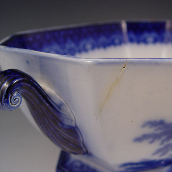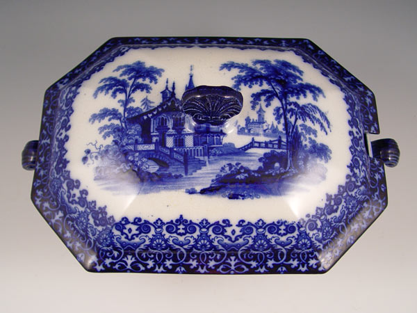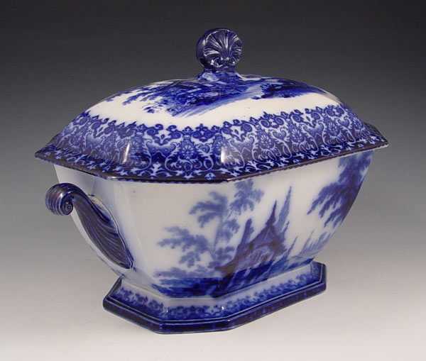 FLOW BLUE COVERED TUREEN: Octagonal shape with scroll handles, pedestal base, ornate final. good blue color. No makers mark. 9 1/2''h. 14'' handle to handle.