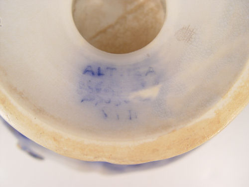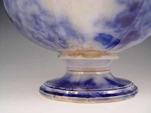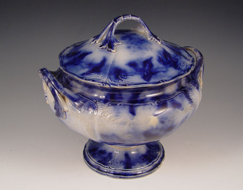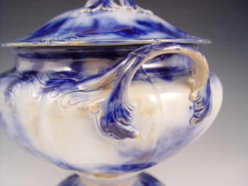 VILLEROY & BOCH FLOW BLUE TUREEN IN THE ALTHEA PATTERN: Footed pedestal, leaf form handles, 10''h, 11'' dia. Please note discoloration and cross hairline.