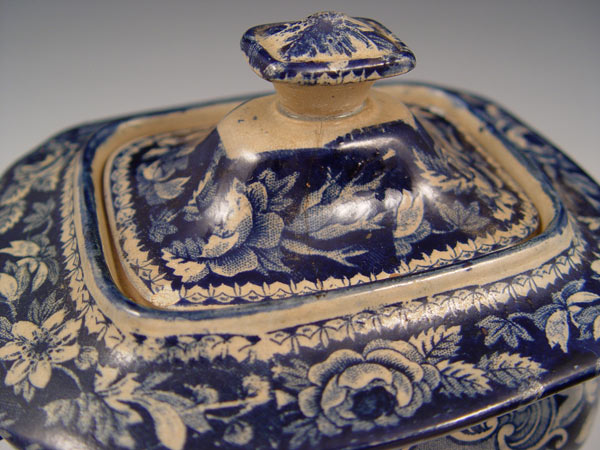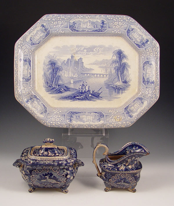 19th C STAFFORDSHIRE TRANSFERWARE PLATTER WITH CREAM PITCHER AND PLATTER: 1) Platter is by TJ & J Mayer, Longport, 1843-1855, in the ''Florentine'' pattern, 15 3/4'' x 12''. 2) ''Fallow Deer and Fawn'' cream pitcher and covered sugar with a very distinctive inner border. Attributed to the Herculaneum pottery.