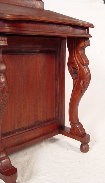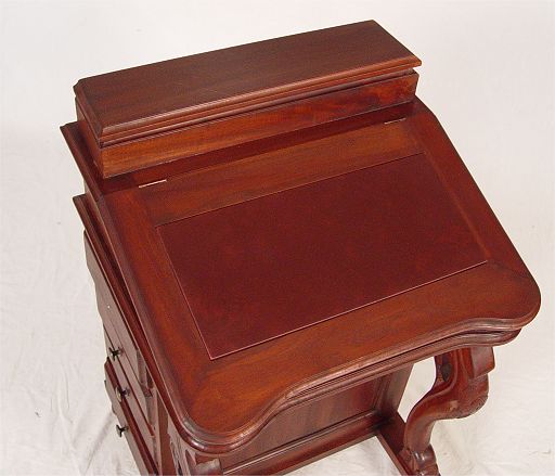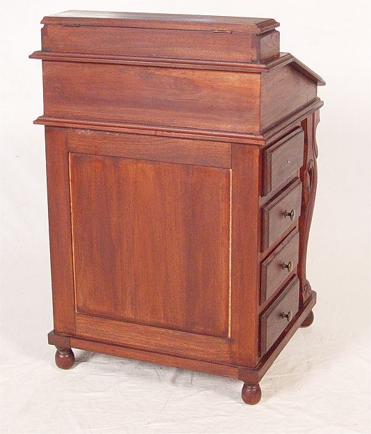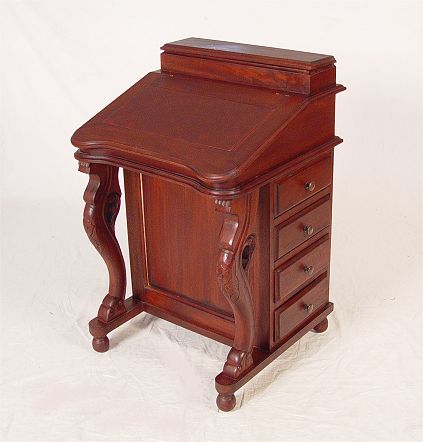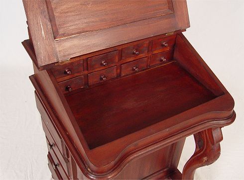 DIMINUTIVE DAVENPORT STYLE DESK: Honduran mahogany leather inset slant top writing desk with 4 drawers down each side, lift top storage, carved leg supports, ball feet. Later 20th C copy of the class English ship captains Davenport desks. 22 1/2'' x 20 1/2'' x 21 1/2''.