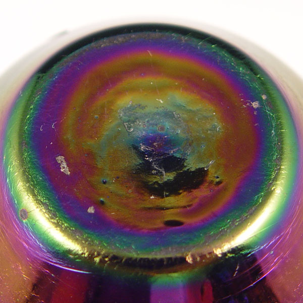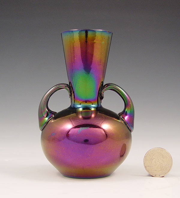 ART NOUVEAU SILVER OVERLAY IRIDESCENT ART GLASS VASE: Amethyst in color, floral silver overlay in flower design, 4 3/4''h.