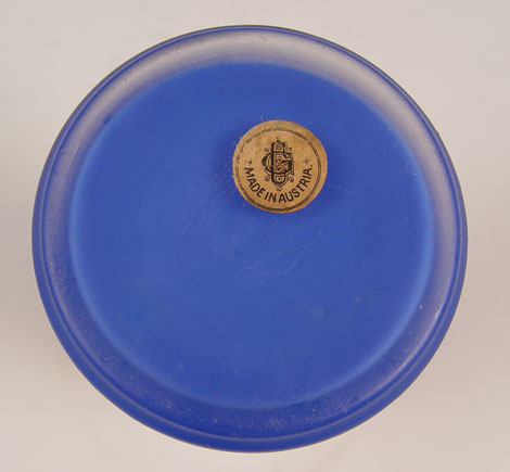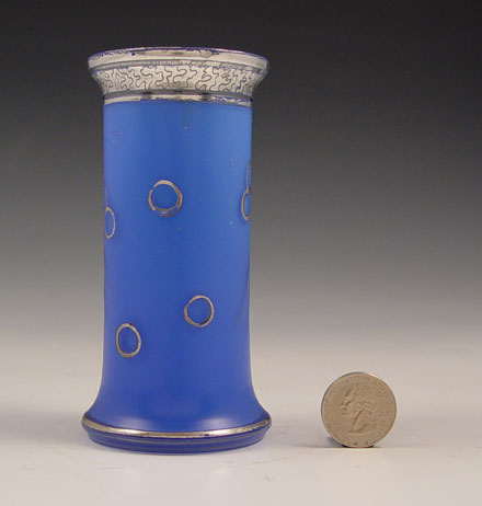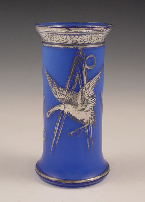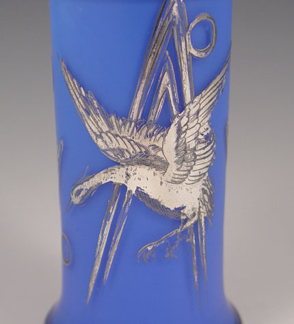 AUSTRIAN SILVER OVERLAY ART GLASS VASE: Blue satin glass overlay with a Phoenix bird design, Austrian paper label. 4 3/4''h.
