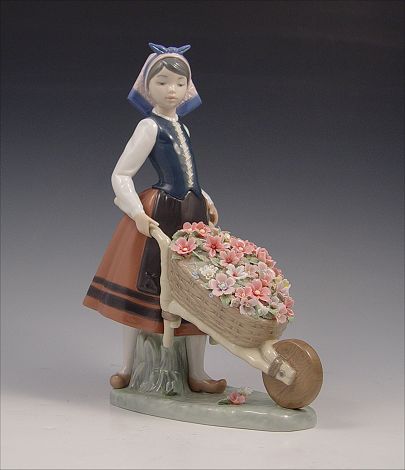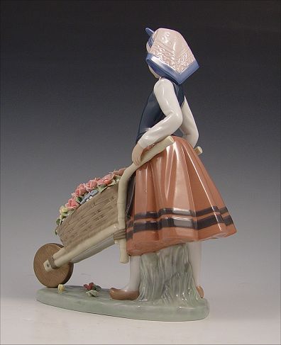 LLADRO A BARROW OF BLOSSOMS 1419: Retired in 2004. Girl with a wheelbarrow of flowers, 10 1/2'' x 7 1/4''.