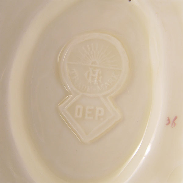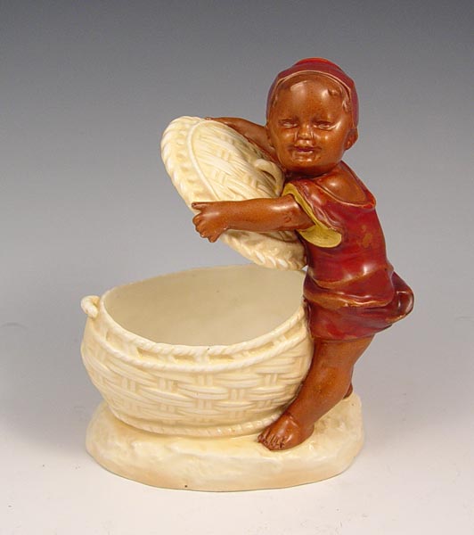 HEUBACH DARK SKIN BABY WITH BASKET: A dark skinned toddler lifting the lid off a basket. Bears the Heubach sun mark. 6 1/2'' x 5 1/2''.