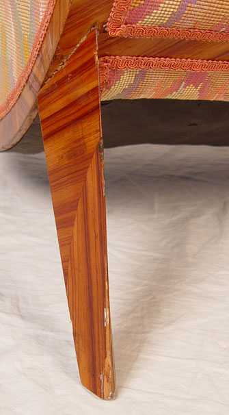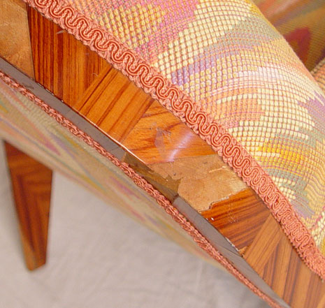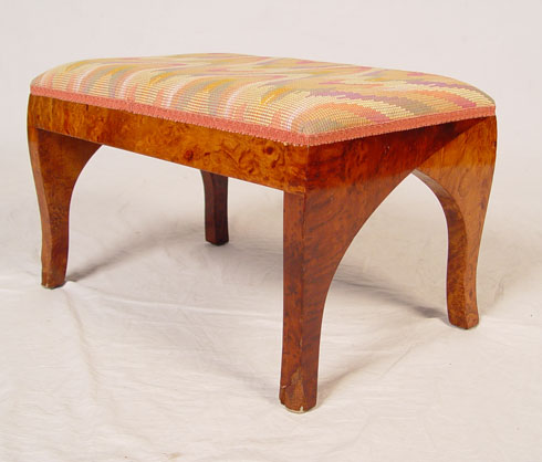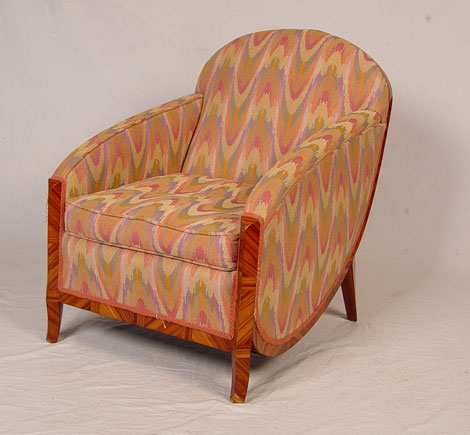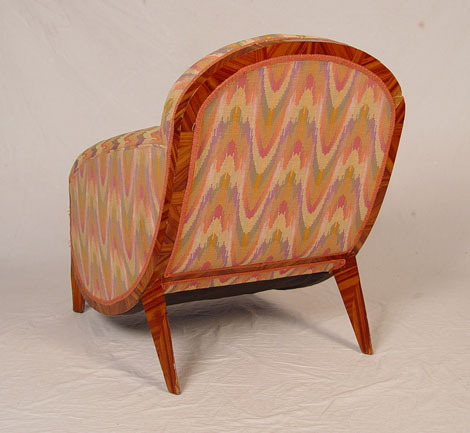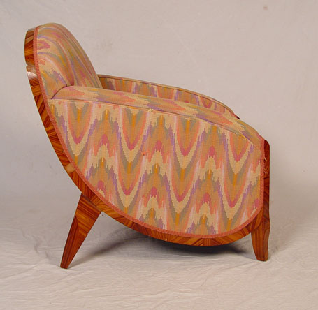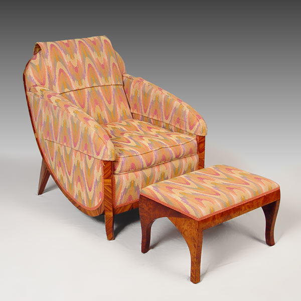 SADDIER FRENCH ART DECO CLUB CHAIR AND OTTOMAN: Rounded sculptural sides on the exotic zebra veneer frame, matching stool. Both in flame stitch fabric. Minor veneer loss. Chair is 32 1/2'' tall x 33'' deep x 25'' wide. Provenance: Estate of and designed by Gertrude Maud Goldsmith, under the pseudonym G.M. de Marygny Denis, in the Paris Exposition of 1927.