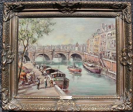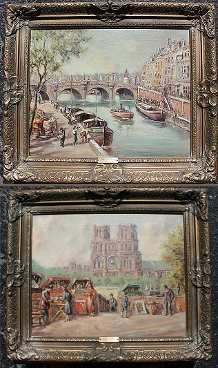 EATON, Morris, (French, 1900-): Pair Parisian street scenes, Notre Dame and the Left Bank, Oils/Canvas, 16'' x 20'' each, encased in custom gilded carved frames with minor wear, 22'' x 26''.