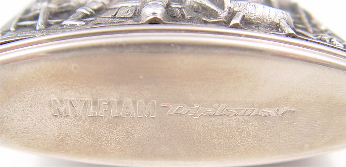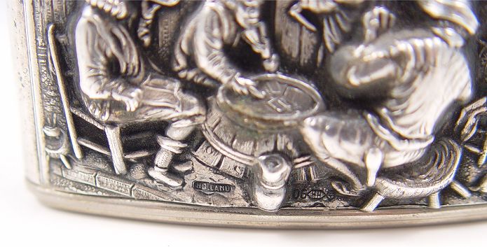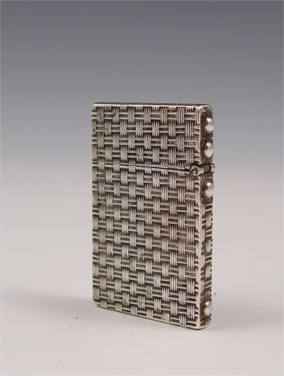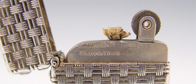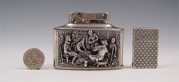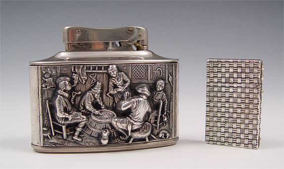 TIFFANY & CO. STERLING BASKET WEAVE LIGHTER: Unique thatch or basket weave design, marked Tiffany & Co. Sterling interior. Measures 1 7/8'' x 1 1/4''. Sold with a Mylflam Diplomat table lighter, silver color metal. Scene of 5 men playing cards. Measures 2 3/4'' high x 3 1/4''.