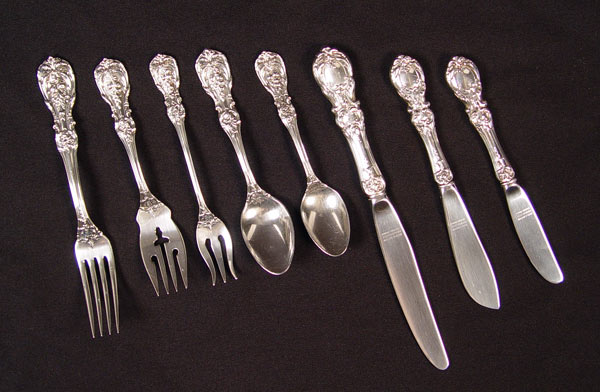 8 REED & BARTON FRANCIS I STERLING FLATWARE: 8 piece place setting by Reed & Barton in the Francis I pattern to include 1) Fork, 7 1/8''. 2) Salad fork, 6 1/8''. 3) Youth teaspoon, monogrammed, 5 1/2''. 4) Teaspoon, 6''. 5) Cocktail fork, 6''. 6) Butter knife, 6 1/2'', 7) Dessert knife, 7''. 8) Place knife, 8 7/8''. Approx. 6.1 troy oz.