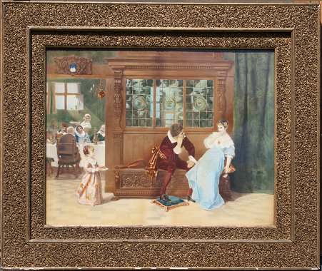 ENHANCED PRINT INTERIOR COURTING SCENE: Sight size 20'' x 26 1/2'', textured gold frame with wear, 30 1/2'' x 36 1/2''.