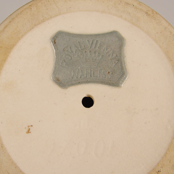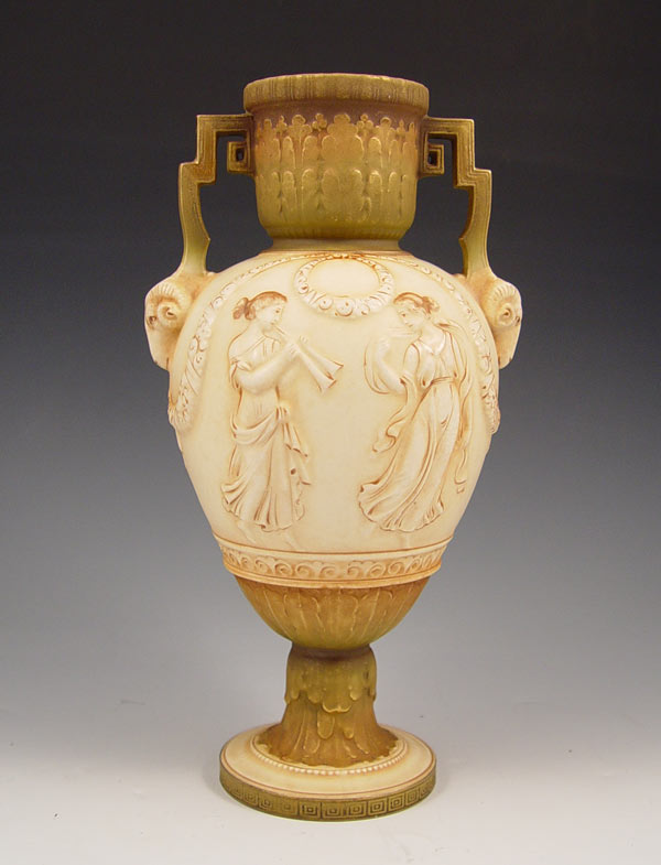 WAHLESS VIENNA PORCELAIN VASE: Double rams head handle vase with molded figures of maidens and iridescent gilt neck and pedestal. 10''h. Ernst Wahliss sold Bohemian porcelain in his Vienna and London stores until purchasing the Stellmacher factory in Turn.