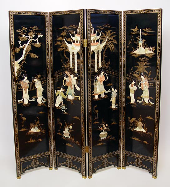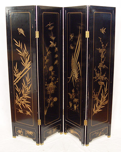 FOUR PANEL CHINESE SCREEN: Carved stone figures in landscape, minor wear black lacquer.