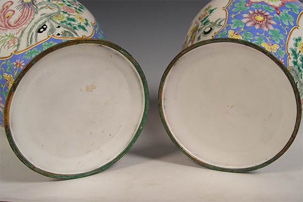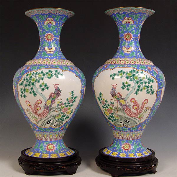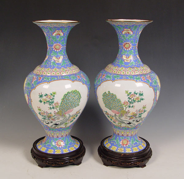 LARGE PAIR CHINESE PEKING ENAMEL VASES ON STANDS: Republic period 1920's-1930. Vases measures 21'' high x 10 1/2'' dia. Overall 23'' high on stands.