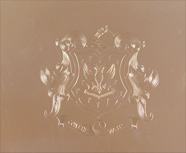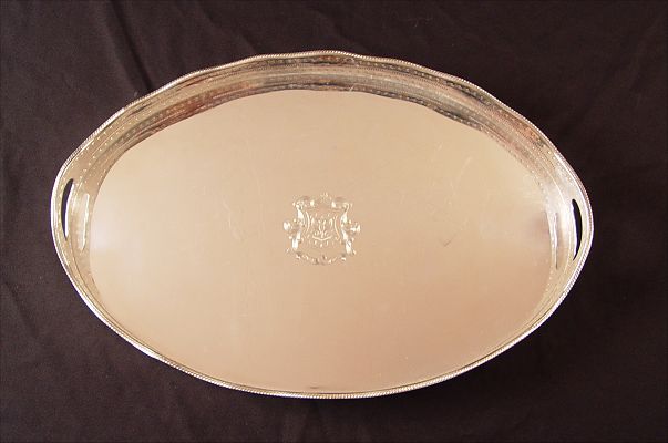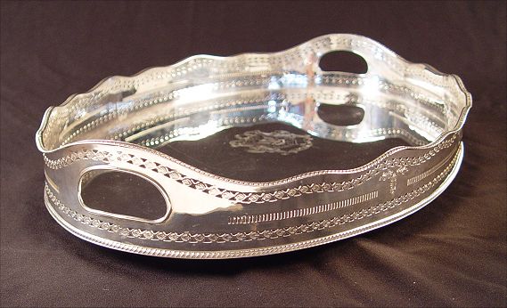 LARGE SILVERPLATE SERVING TRAY: No visible hallmarks. Pierced and engraved gallery, engraved design center of tray with heraldic shield and motto ''Contre Vair''. Measures 3'' h. x 23 3/4'' x 15 3/4''.