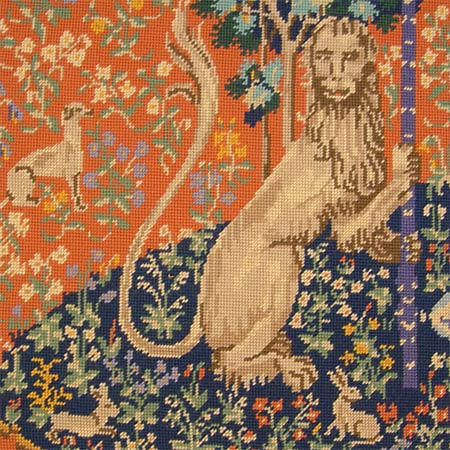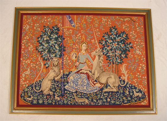 UNICORN AND LADY NEEDLEPOINT: After the famed Unicorn Tapestries. 37'' X 48'' overall.