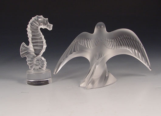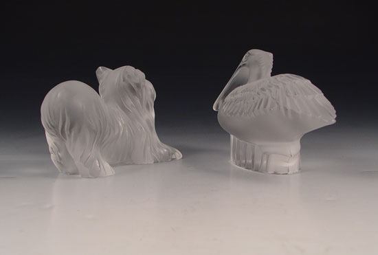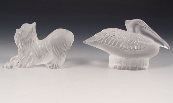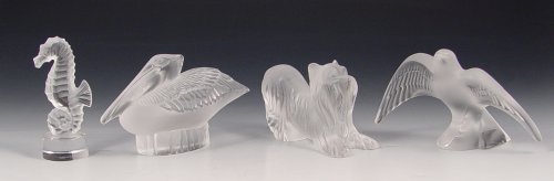 4 LALIQUE FRENCH CRYSTAL ANIMALS: 1) Yorkshire Terrier, 3'' tall. 2) Pelican, 5 1/2'' long. 3) Bird in Flight, 5 3/4'' long. 4) Seahorse, 4'' tall. All signed ''Lalique France''.