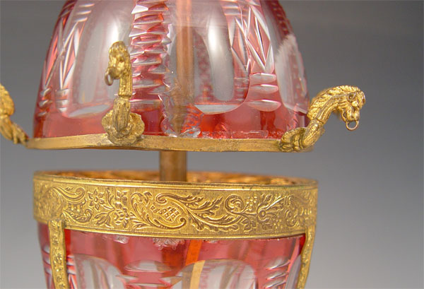 RUSSIAN CRANBERRY CUT TO CLEAR GLASS EGG: Marble & brass base, interior holds glass vials. Note missing crystal drops and several chips along glass. 13''h.